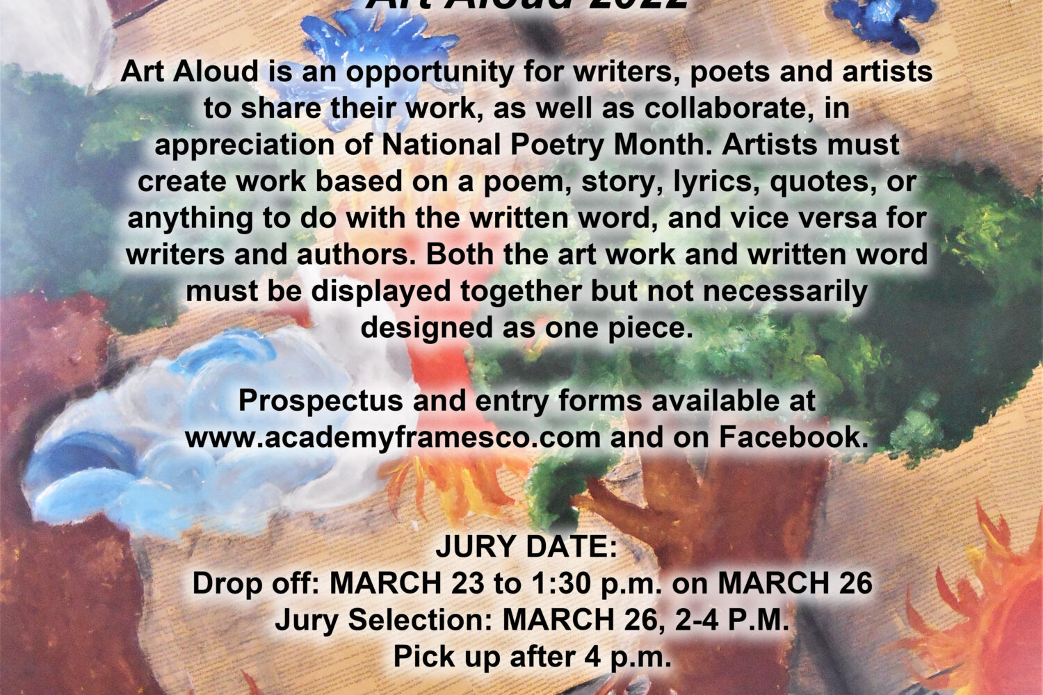 Art Aloud is an opportunity for writers, poets and artists to share their work, as well as collarborate, in apprecattion of National Poetry Month. Artists must create work based on a poem, story, lyrics, quotes or anything to do with the written word, and vice versa for writers an authors.
