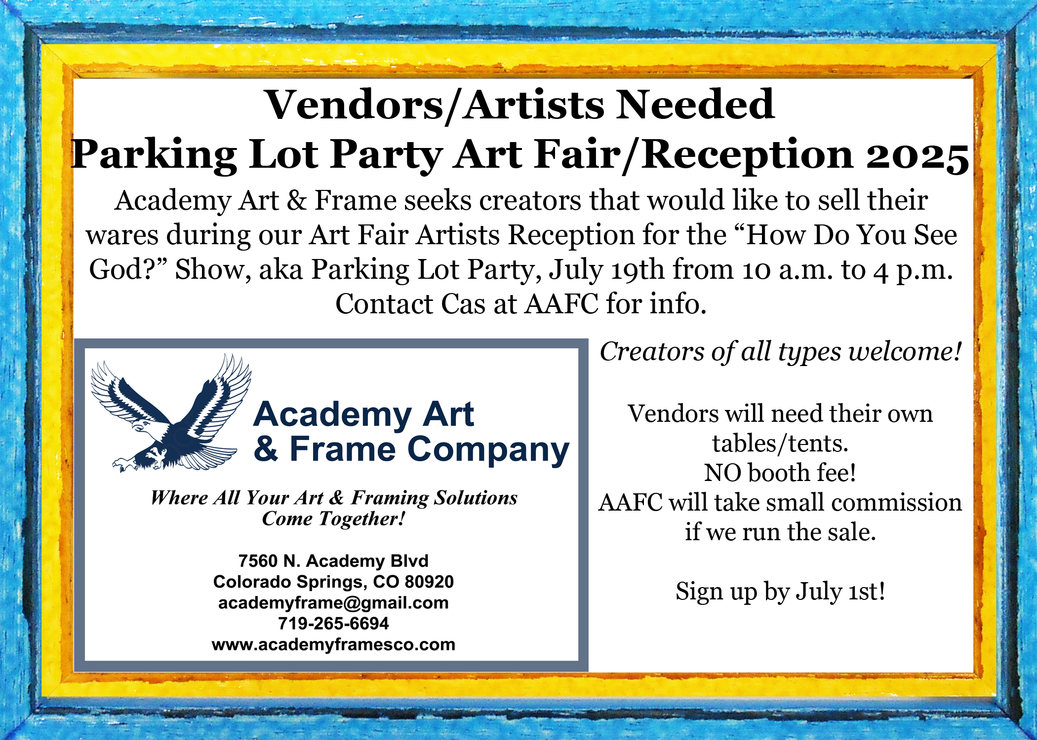 Academy Art & Frame seeks creators who would like to sell their wares during our Art Fair Artists Reception for the “How Do You See God?” Show aka Parking Lot Party!