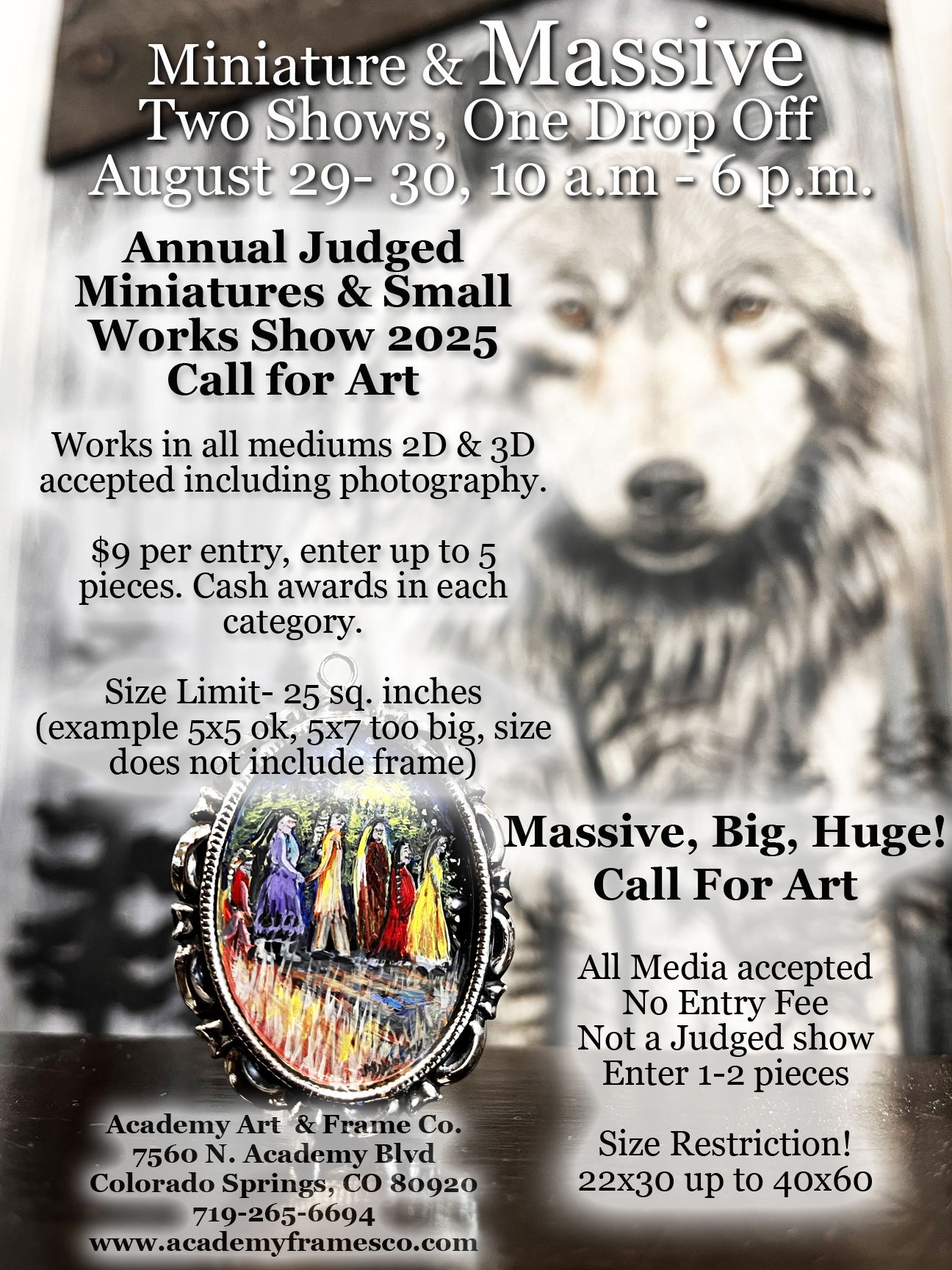 In conjunction with the Annual Miniature Show, Massive paintings display an amazing juxtaposition of size. Large and small; Massive and mini; 2 scales, 2 shows, all at the same time. Test your skills and see if you can create artworks that meet both requirements.
