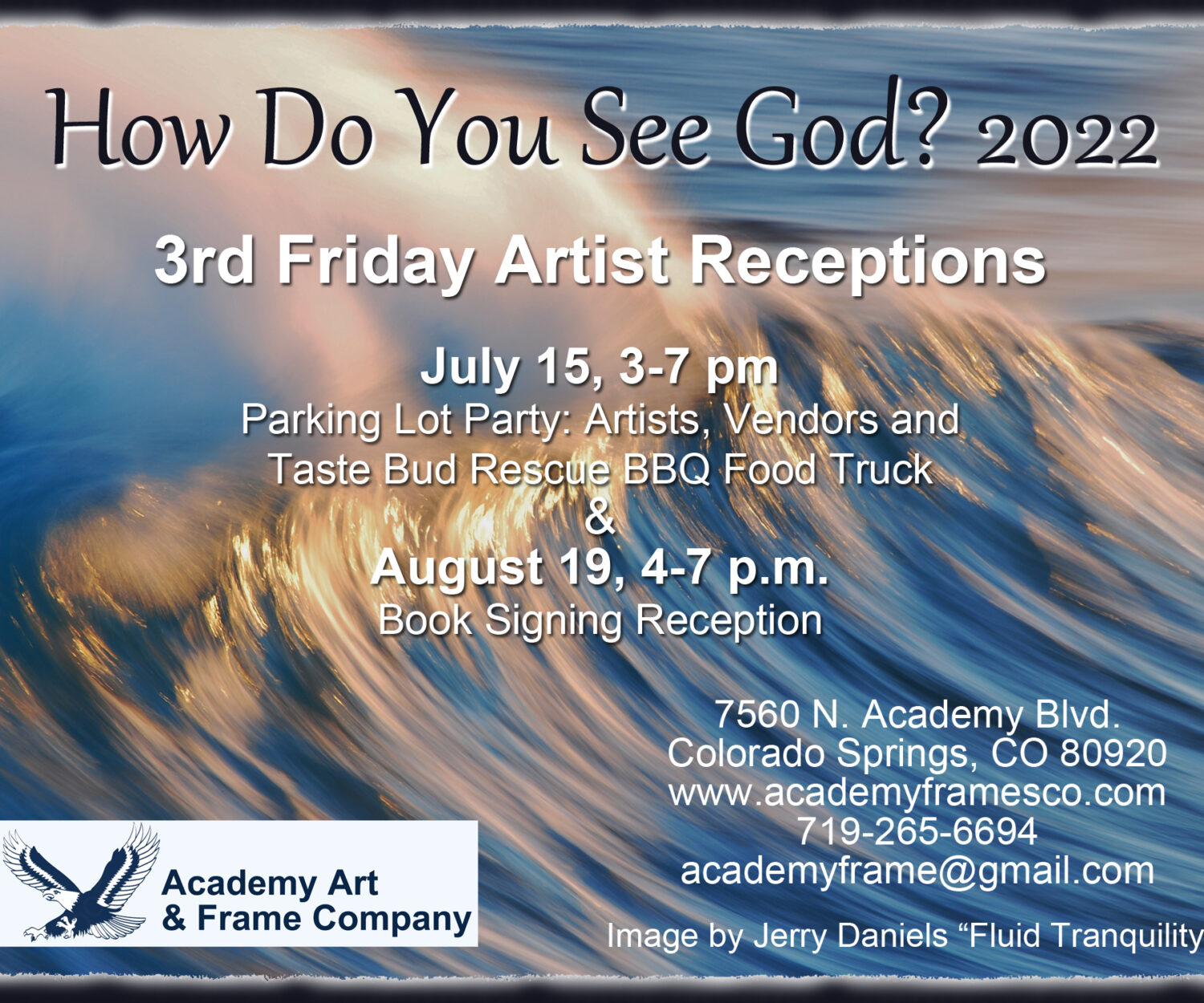 05 Jul 2022 How Do You See God? Exhibition and Parking Lot Party Join us for our 3rd Friday Events in July and August. On July 15th from 3-7 p.m. come enjoy the… Academy Art & Frames Co.