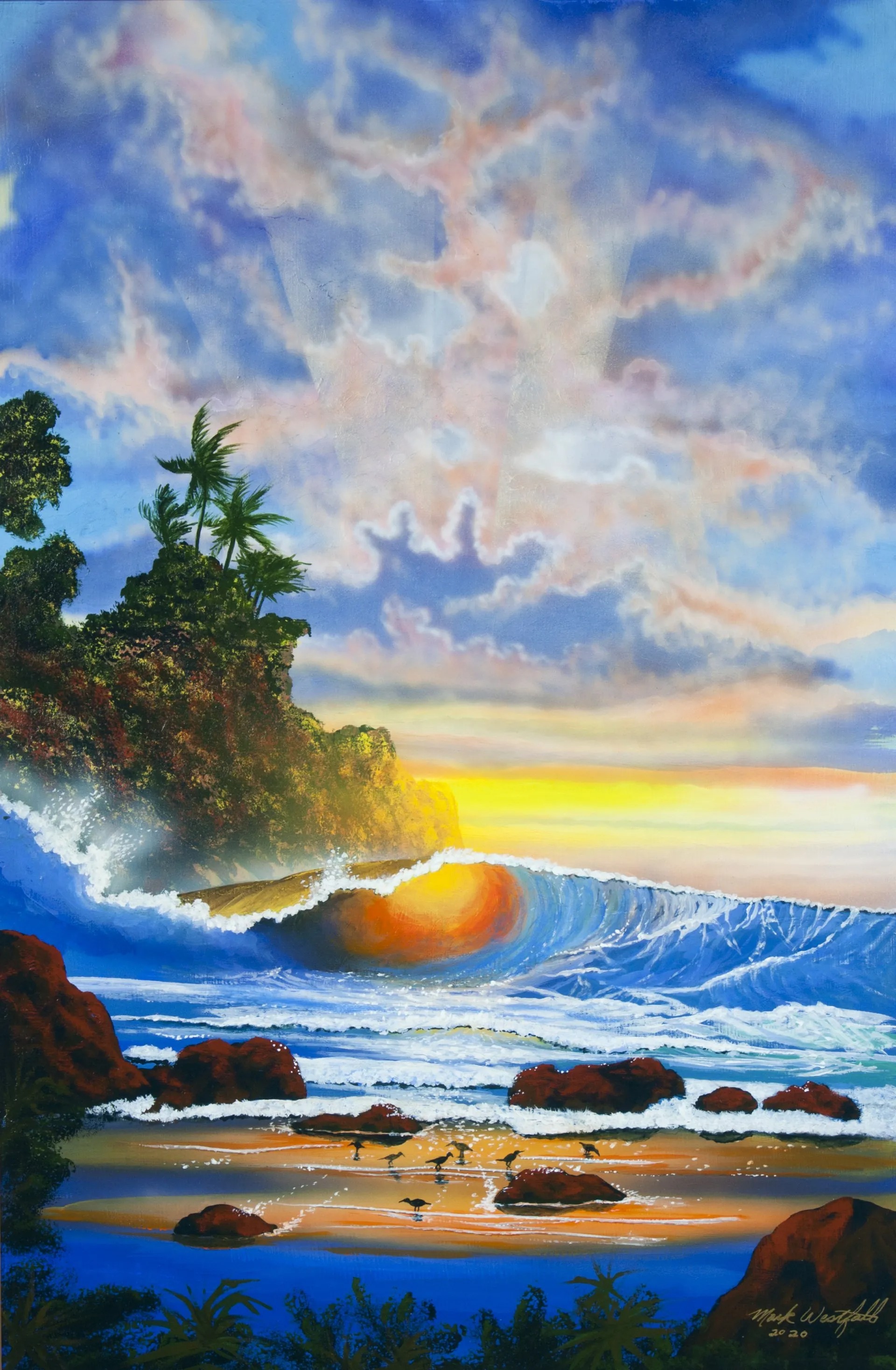 The cover image is Sunset Waves Radiate painted by Mark Westfall. Mark was a long time friend of Kim Costello and big supporter of AAFC, and Kim chose his image for the cover in honor of his memory. Mark recently died due to a long cancer battle and our hearts and love go out to his friends and family.